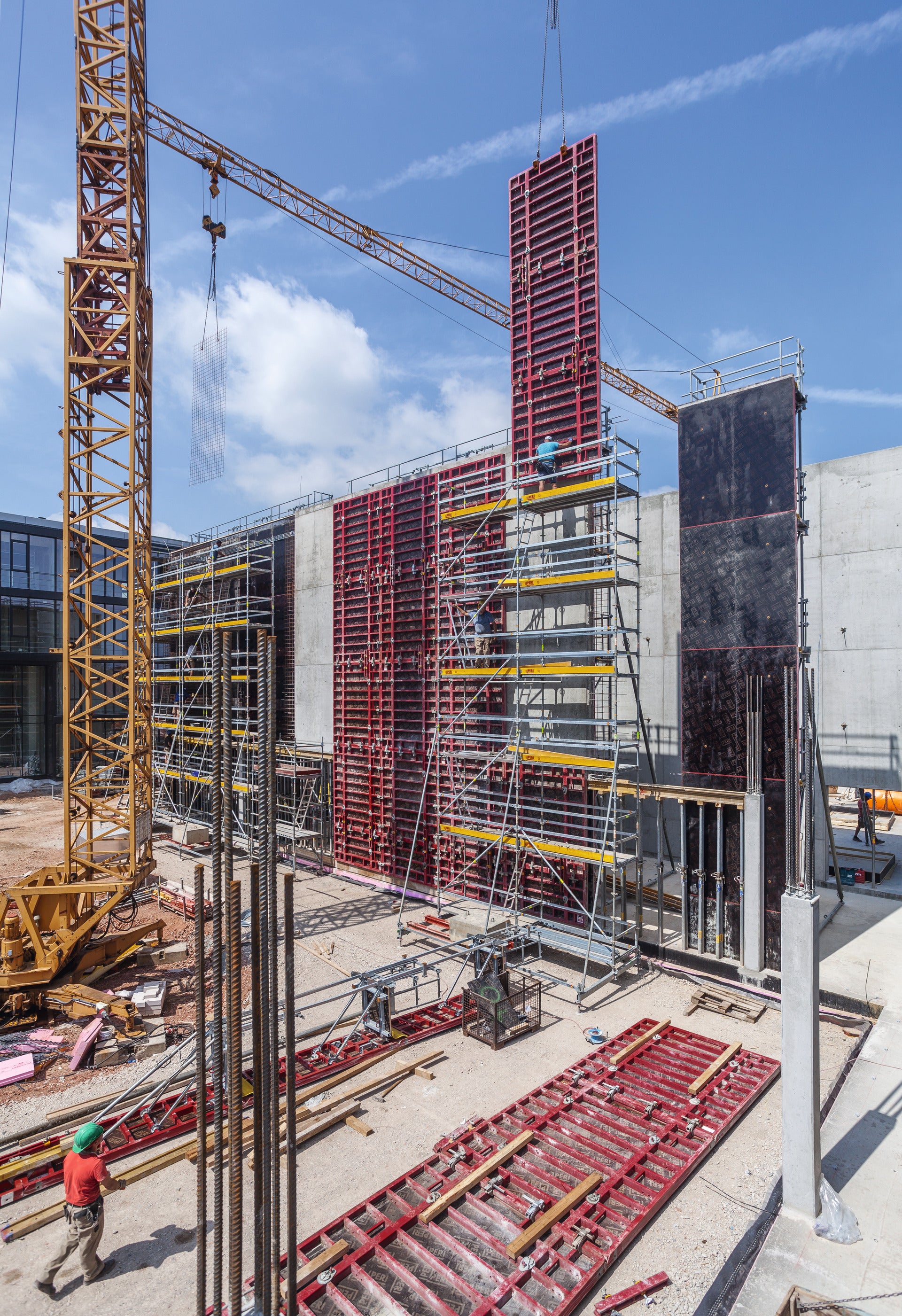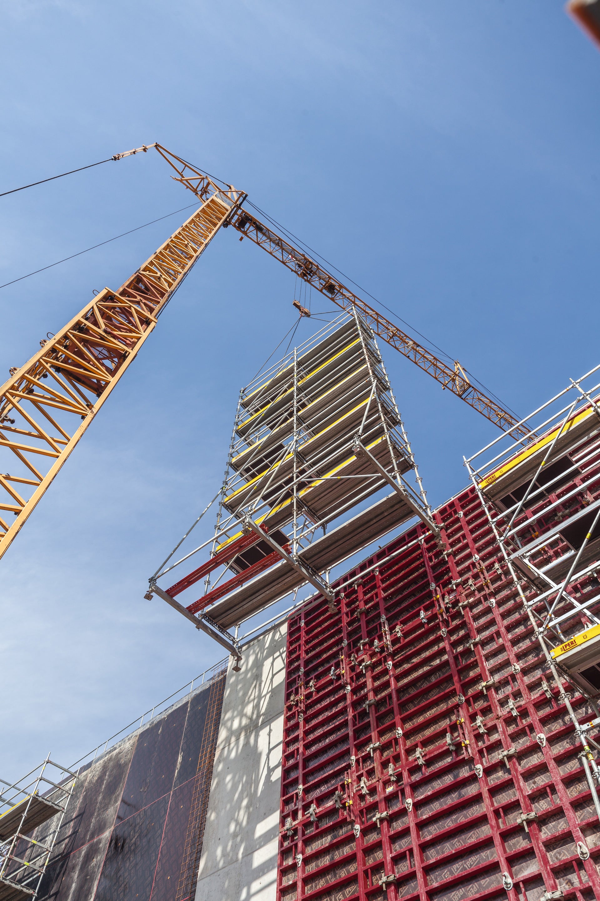 In conjunction with the MAXIMO, the PERI UP reinforcement scaffolds also have an accelerating effect on the construction process: when cleaning the formwork, carrying out the reinforcement work and connecting the closing formwork that can be implemented over large areas. -